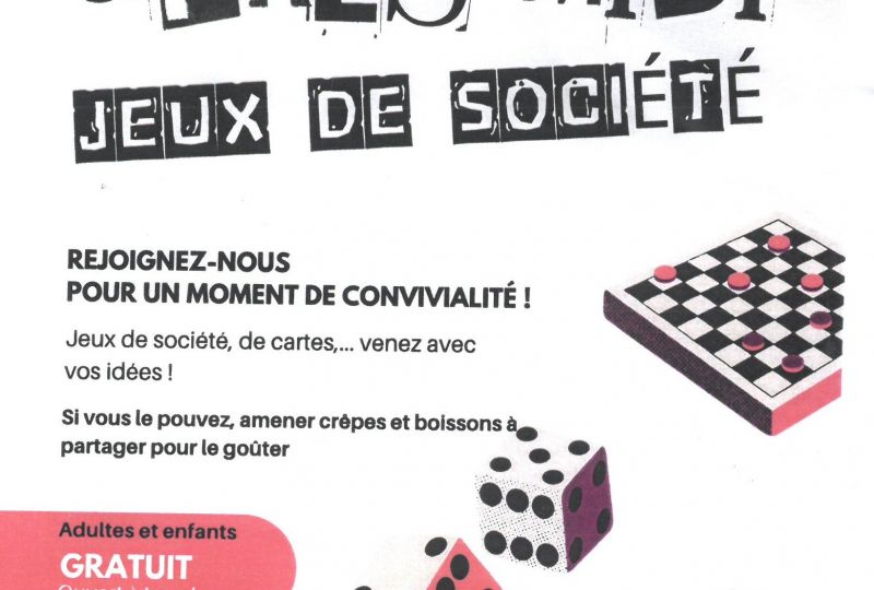 La commission animation communale oranise une après-midi jeux de société le venfredi 7 févrizer 2026 à partir de 14 h 30 àà la salle des fêtes de St Maca&ire du Bois: jeux de société, cartes, ... Vous pouvez apporter des crèpes et