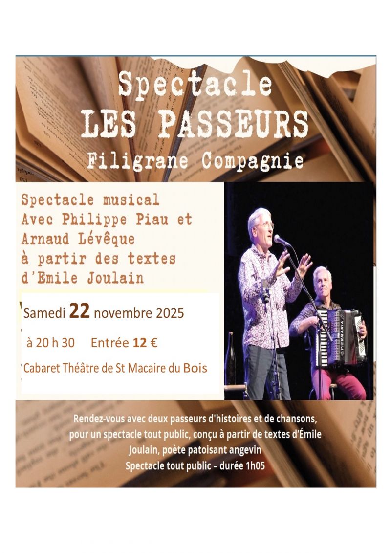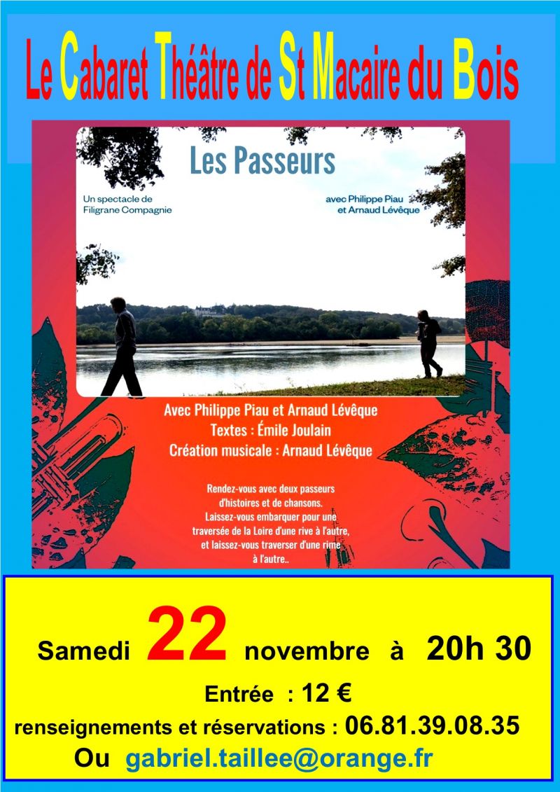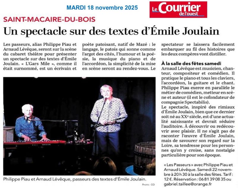 Le cabaret théâtre de St Macaire recoit lArnaud Lévêque et Philippe PIAU de la compagnie filigrame pour interpréter des rimiaux d'Emile joulain "l'Gars Mile", poête patoisan de Mazé près de Beaufort en Ajou (49) qui nous conte avec humour et poésie la Loire à travers des histoires simples de la vie paysanne de la région de la Loire; spectacle vivant et poétique pour tout public Arnaud lévêque est miusicien, compositeur et comédien; Philippe PIAU est comédien, auteur et metteur en scène, cofondateur de la Compagnie Spectabilis